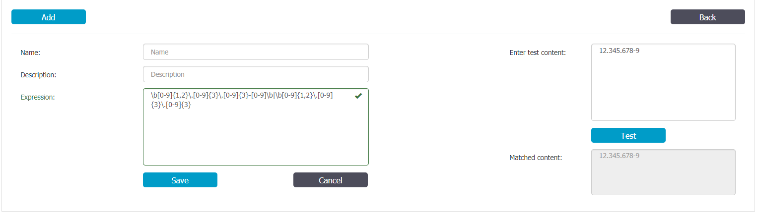 A criação de expressões regulares pode ser encontrada na área de Blacklist (Lista negra) que se encontra na sessão Blacklists e Whitelists. Elas estão disponíveis para serem usadas nos módulos de Content Aware Protection e eDiscovery.