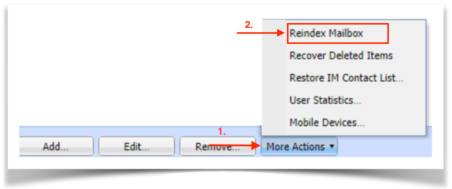 Clique em Mais Ações e em Reindexar Caixa de Correio.