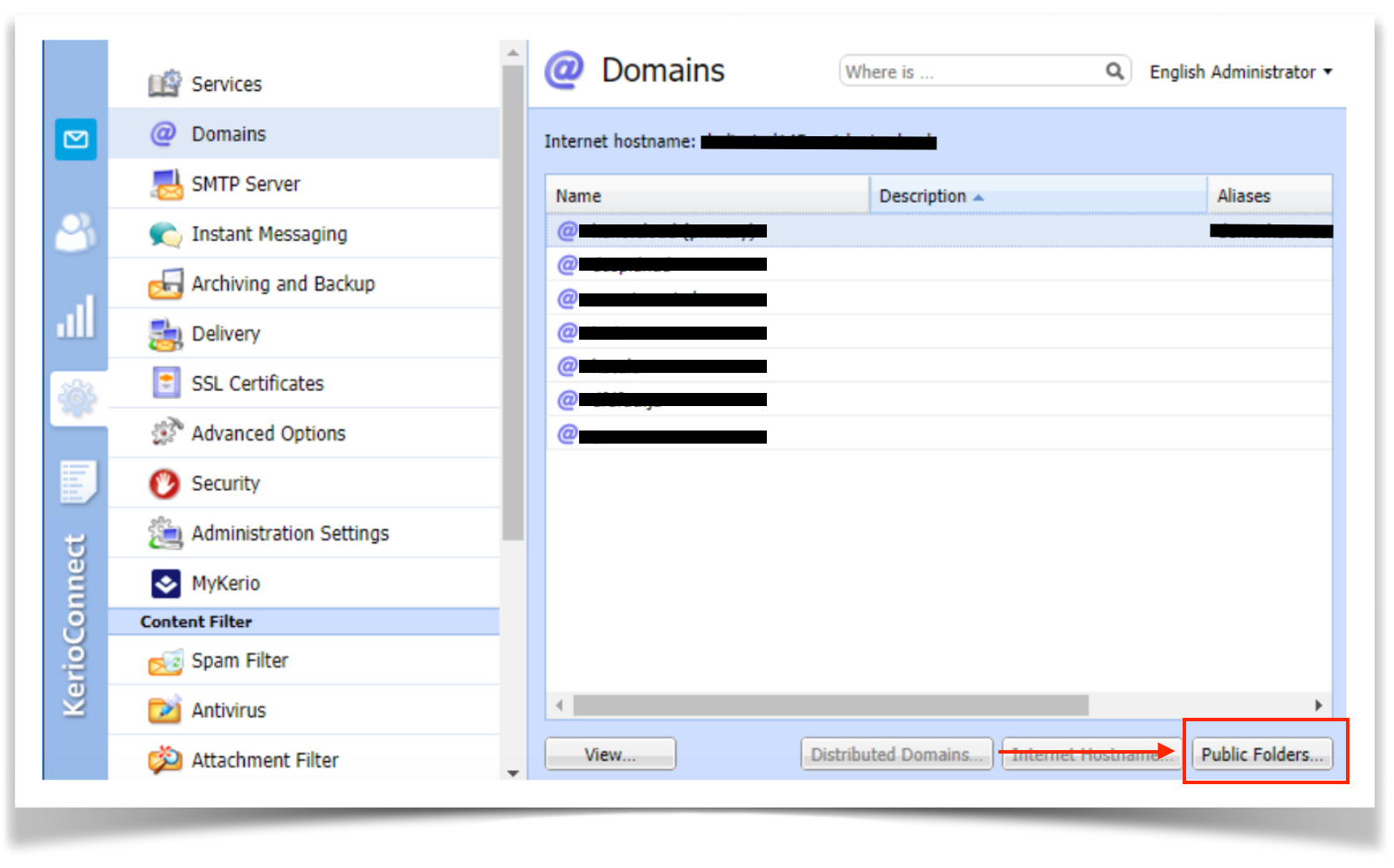 - Na administração Kerio Connect, navegue até Configuração> Domínios.