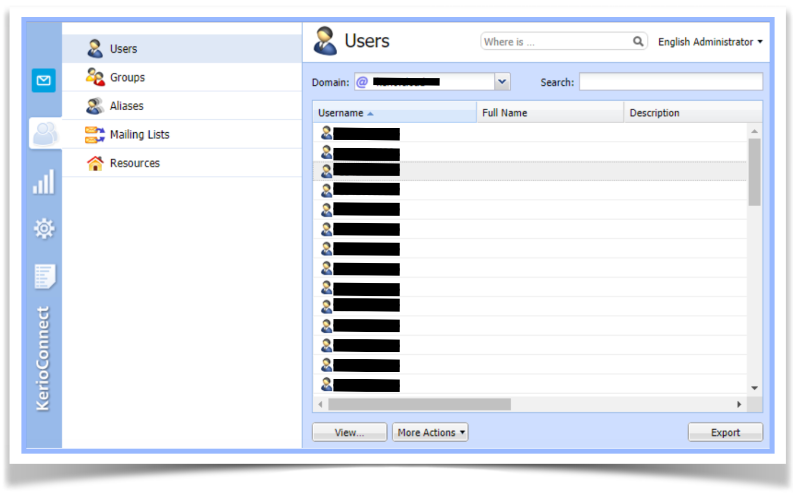 - Faça login no Kerio Connect Administration usando uma conta de administrador com direitos de acesso de 'leitura / gravação'.